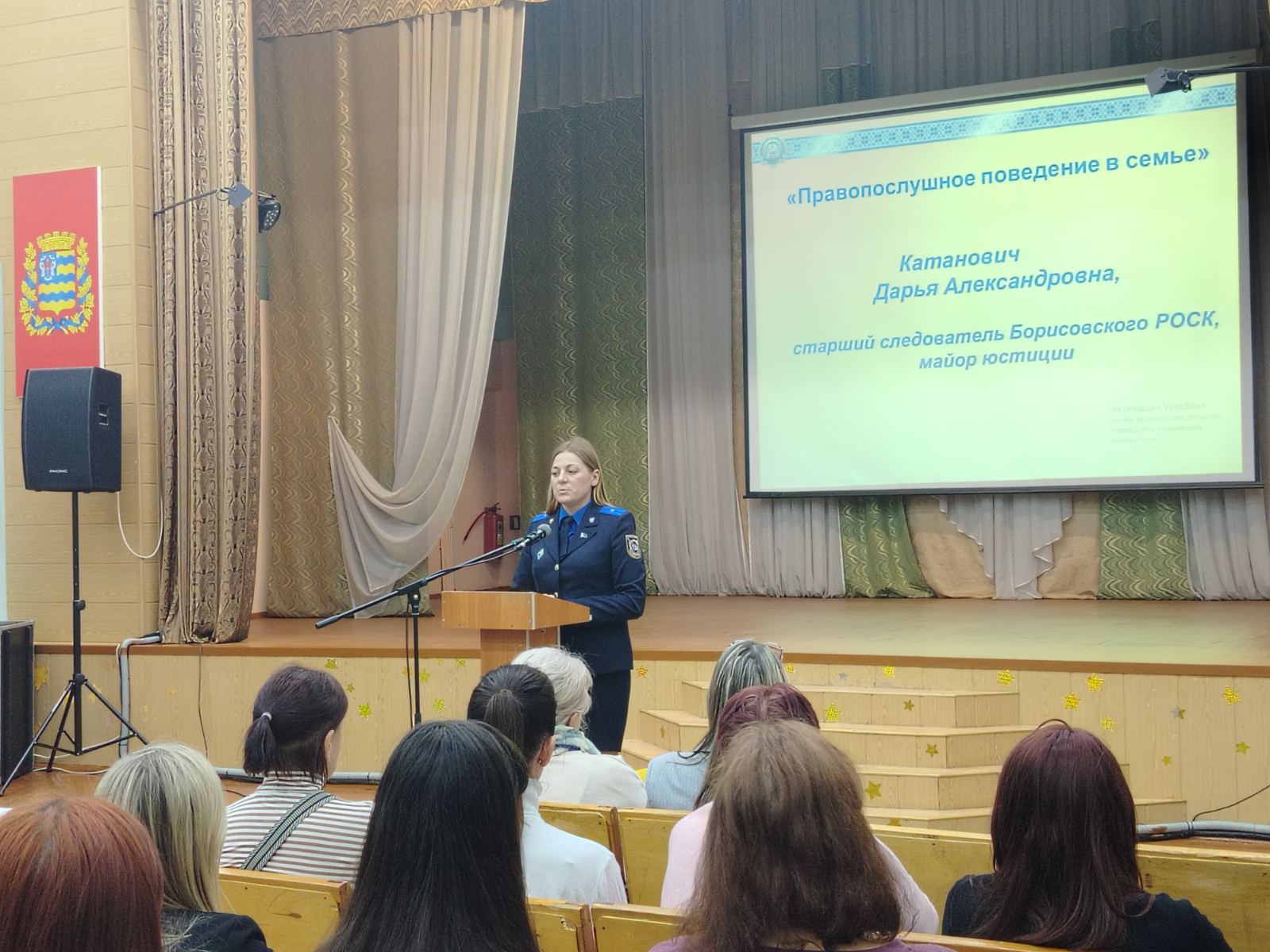Старший следователь Борисовского РОСК, майор юстиции Катанович Д.А. рассказала присутствующим о подходах в воспитании детей и озвучила ответственность законных представителей за насильственные действия в отношении несовершеннолетних, приведя примеры из следственной практики.