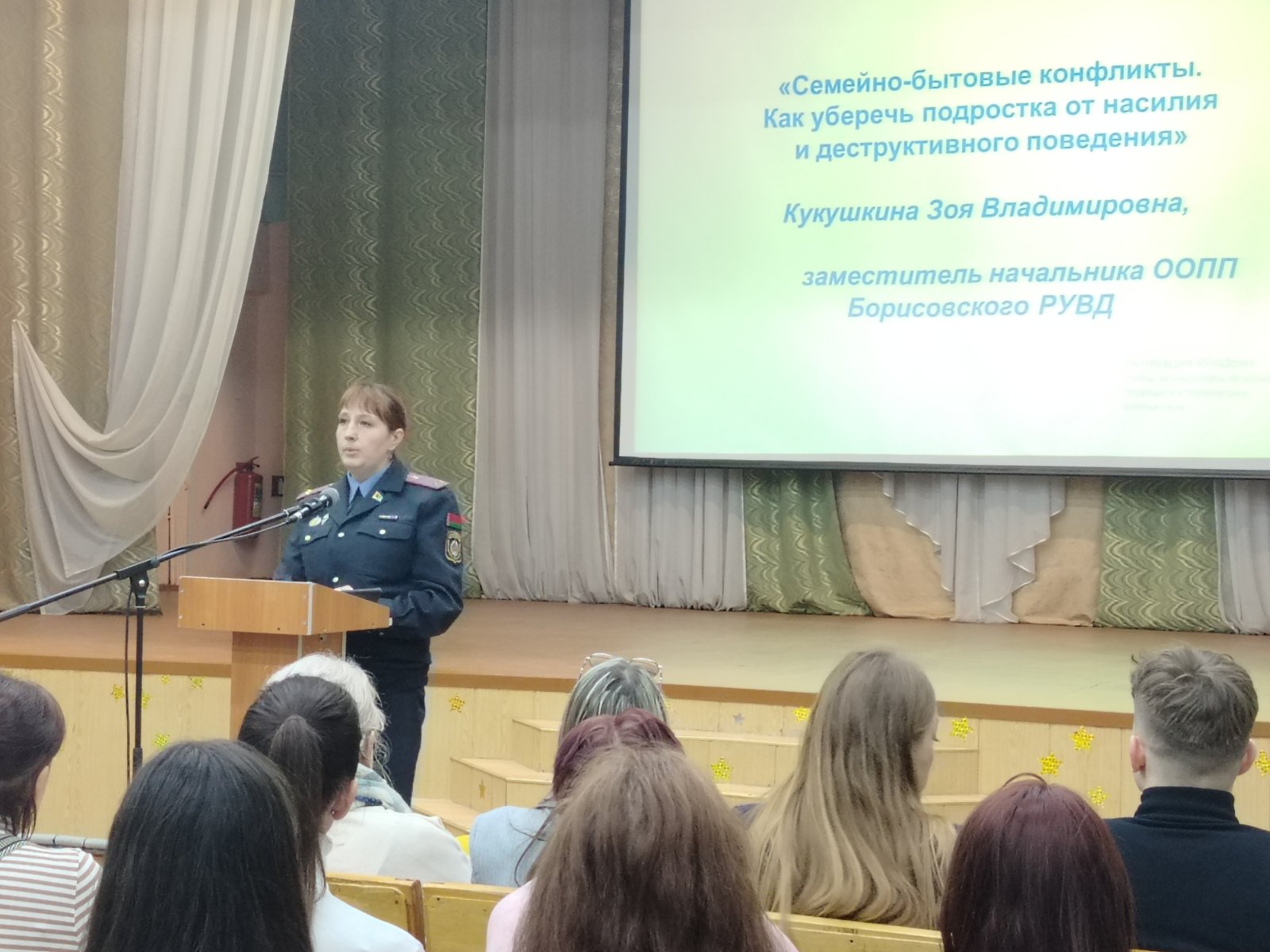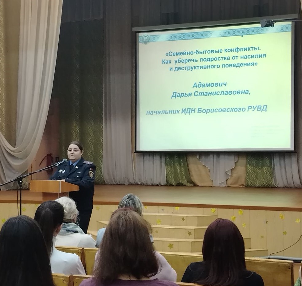 Начальник ИДН Борисовского РУВД Адамович Д.С. рассказала законным представителям о том, как уберечь подростка от насилия и деструктивного поведения.