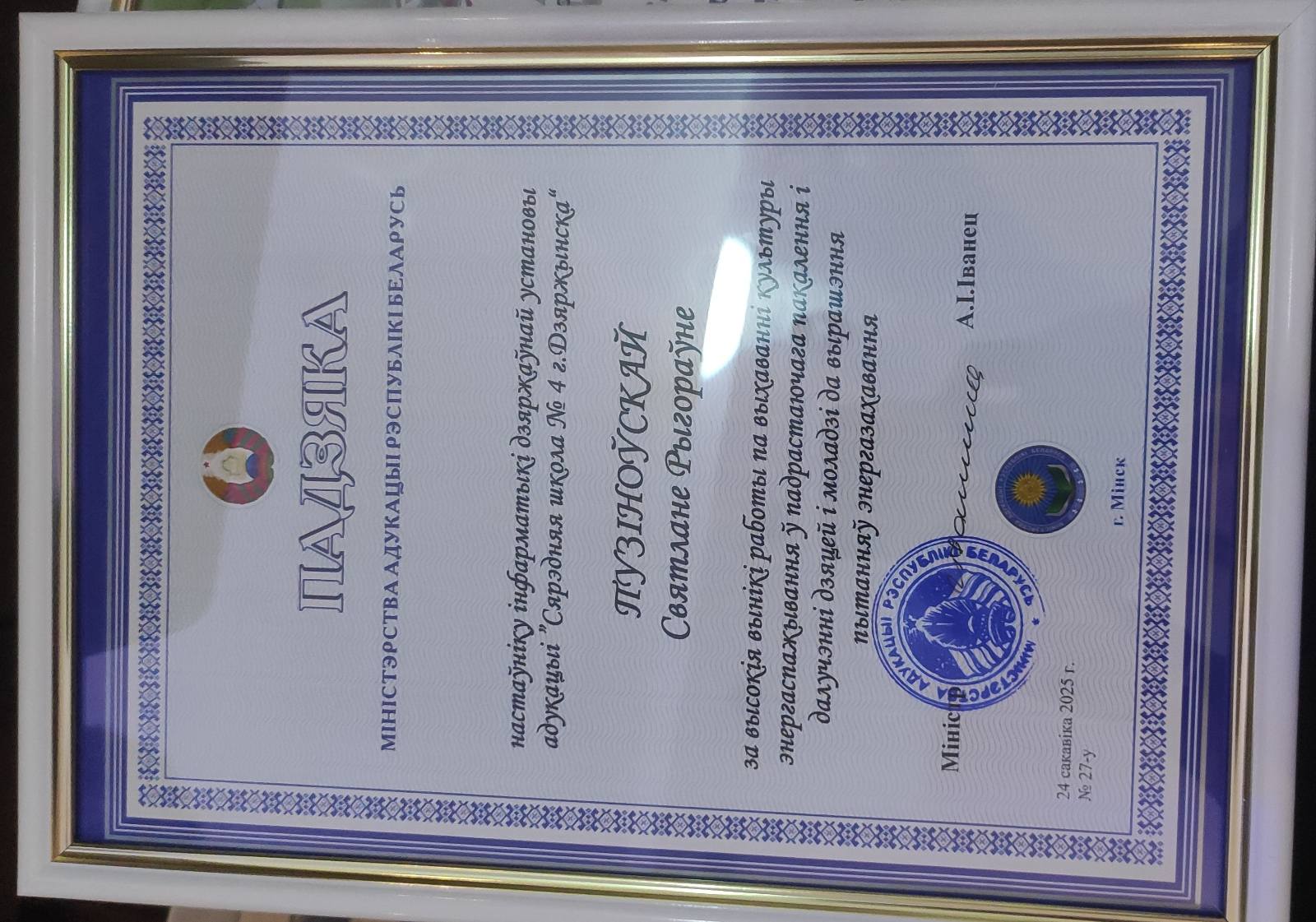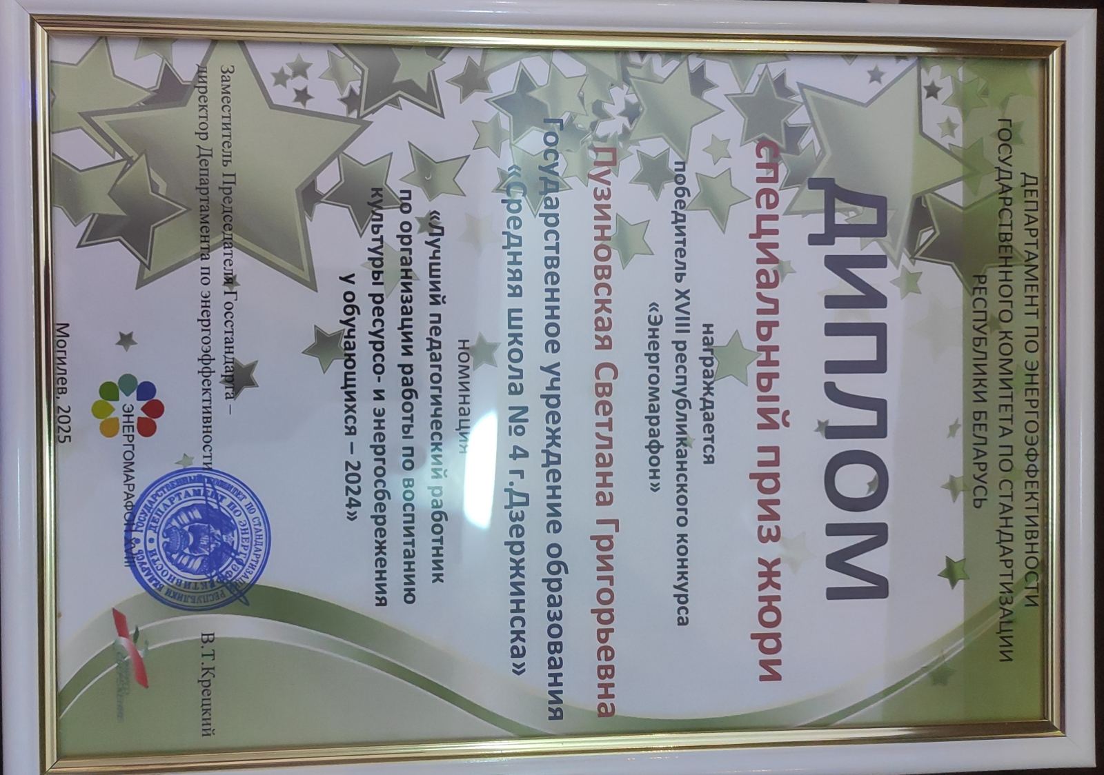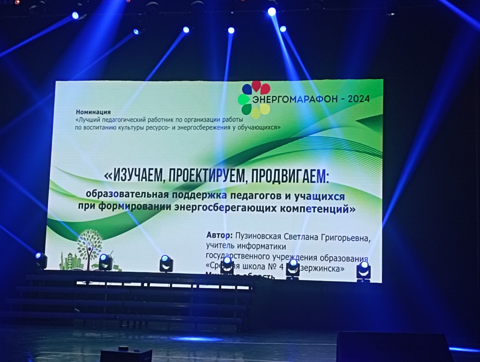специальным призом жюри в номинации «Лучший педагогический работник по организации работы по воспитанию культуры ресурсо- и энергосбережения у обучающихся» за работу «Изучаем, проектируем, продвигаем: образовательная поддержка педагогов и учащихся при формировании энергосберегающих компетенций» награждена Пузиновская Светлана Григорьевна, учитель информатики ГУО «Средняя школа № 4 г. Дзержинска»;