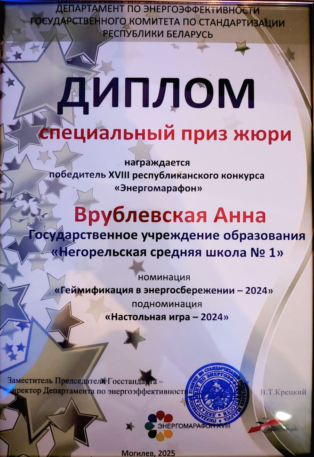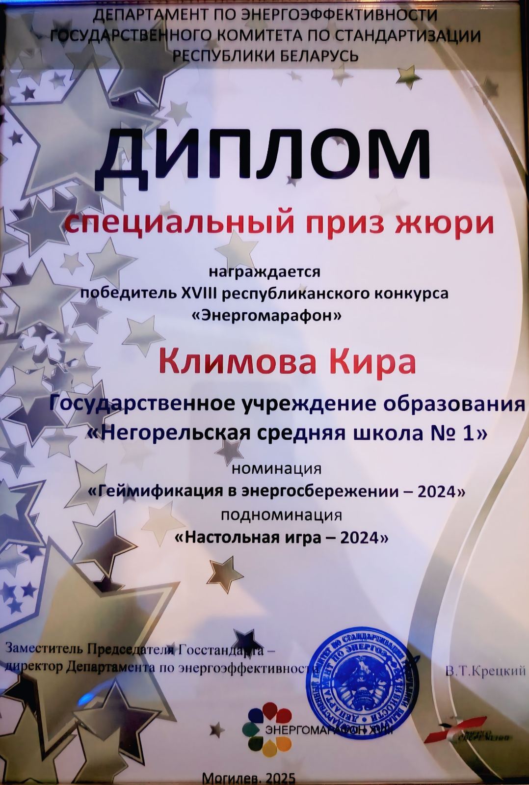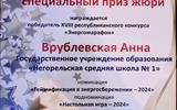 специальным призом жюри в номинации «Геймификация в энергосбережении», подноминации «Настольная игра» награждены Врублевская Анна, Климова Кира, учащиеся ГУО «Негорельская средняя школа № 1» Дзержинского района, руководитель Титова Анна Александровна, учитель информатики и физики.