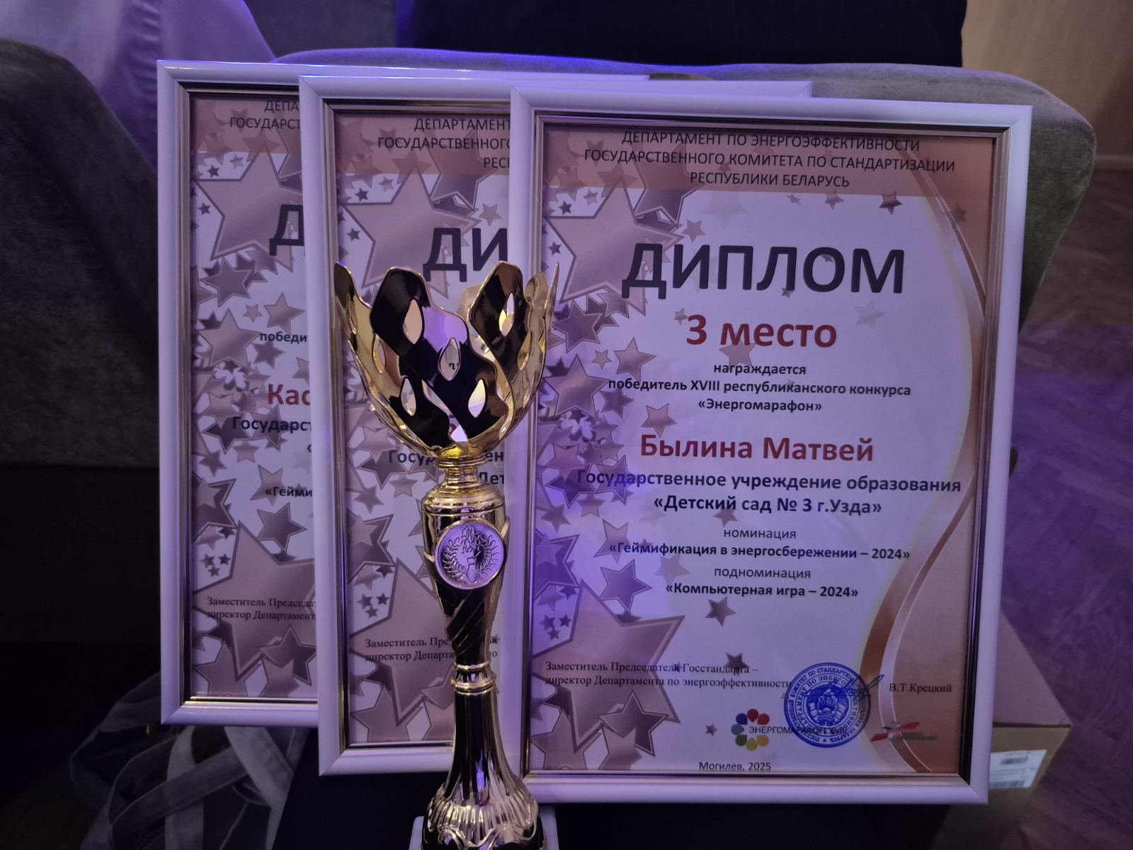 дипломом IIІ степени в номинации «Геймификация в энергосбережении», подноминации «Компьютерная игра» за работу «Путешествие с Лампариком» награжден коллектив воспитанников ГУО «Детский сад № 3 г. Узда», руководитель Протасевич Ольга Ивановна, заведующий;