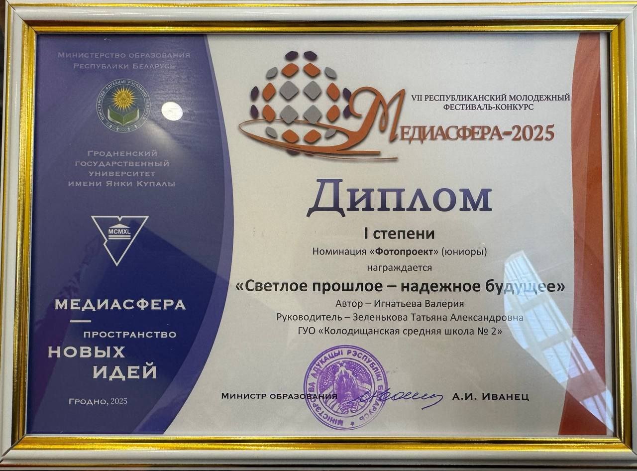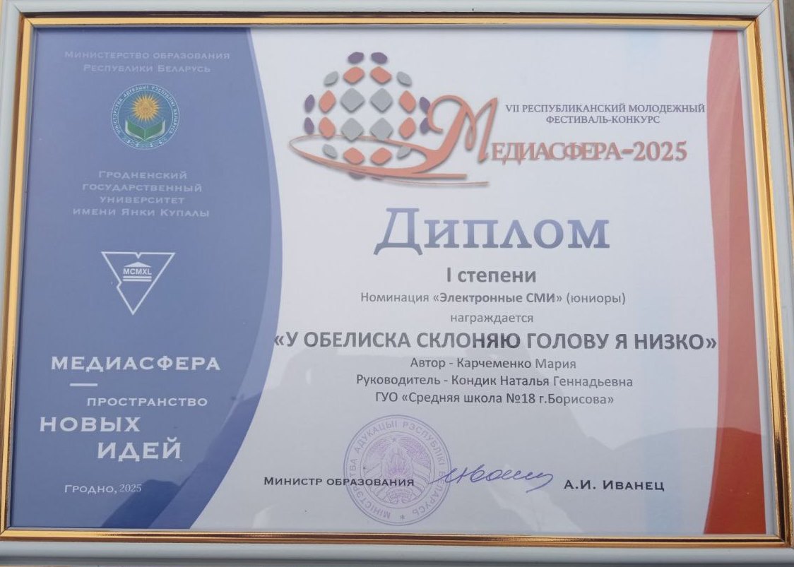 Диплома I степени удостоена Карчеменко Мария, учащаяся средней школы № 18 г. Борисова