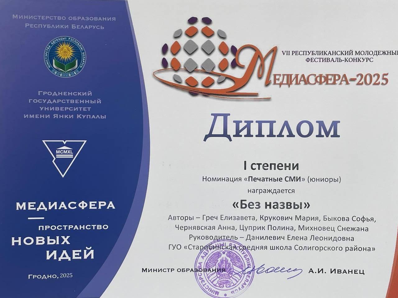 Дипломом I степени награждены Греч Елизавета, Крукович Мария, Быкова Софья, Чернявская Анна, Цуприк Полина, Михновец Снежана, учащиеся Старобинской средней школы Солигорского района»