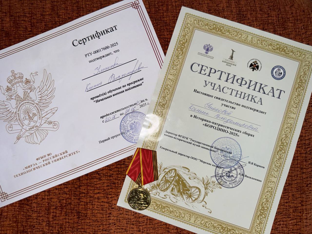 Наши ребята привезли домой сертификаты от директора ФГБУК «Государственный Бородинский военно-исторический музей-заповедник», генерального директора ООО «Морские котики», первого проректора «МИРЭА-Российского технологического университета», памятные медали.