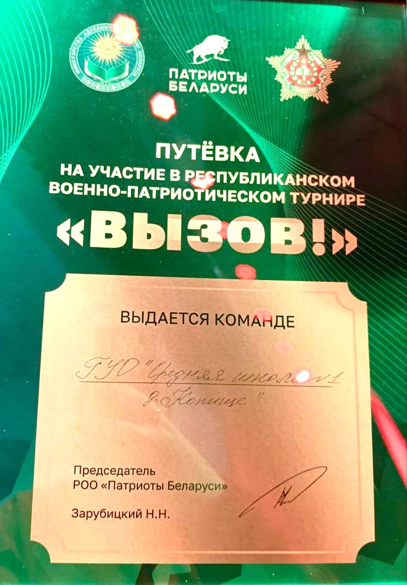 - 4 место – команда «Сокол» ГУО «Гимназия имени В. Ф. Купревича г. Смолевичи», Прибыльский Илья Сергеевич, руководитель по военно-патриотическому воспитанию;